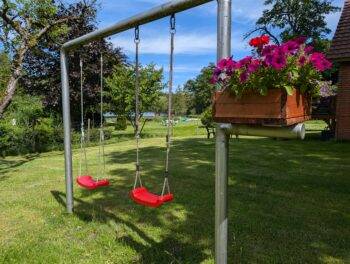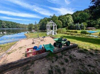 Das große Grundstück bietet viele Sitzbereiche mit Blick auf den See. Für die Kleinen stehen Schaukel und Sandkiste bereit. Ein besonderes Highlight für die kleinen Gäste sind die Shetlandponys, die gern gefüttert, geputzt und gestreichelt werden können. Im hofeigenen Privatsee können Sie angeln, schwimmen, paddeln und den traumhaften Ausblick genießen.