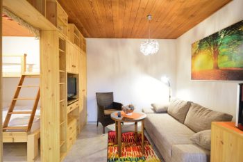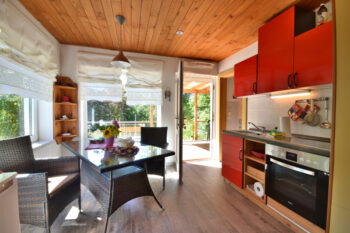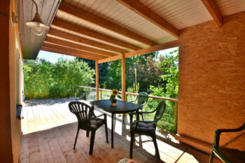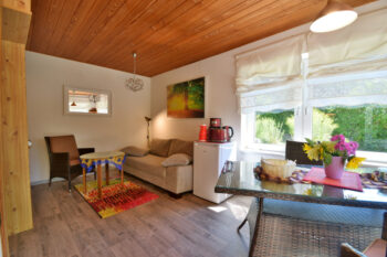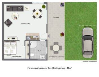 Das kleine Juwel „Ferienhaus Labenzer See“ liegt direkt an einem Südhang am Groß Labenzer See. Auf 30 m² finden bis zu 3 Personen Platz zur Erholung. Der Bungalow besitzt ein Gründach, welches für ein angenehmes Klima zu jeder Jahreszeit sorgt. Die Wärmewellen-Heizkörper unterstützen zudem das gesunde Raumklima. Das Haus besitzt große, zum See ausgerichtete Fenster, die viel Licht bieten. Das Wohn-Schlafzimmer ist mit einem Essbereich, Schlafsofa (1,60 m breit) und einer Küchenzeile ausgestattet. Der Sat-TV, die Spiele und Bücher sogen für Unterhaltung am Abend. Das Schlafzimmer ist mit einem Fachwerkbett ausgestattet. Unten befindet sich ein 1,60 m breites Doppelbett, oben ein 0,90 m breites Einzelbett. Das Verdunkelungsrollo und die Fliegenschutzgitter sorgen für einen erholsamen Schlaf. Das moderne Bad ist mit Dusche und Föhn ausgestattet. Ein Kinderreisebett + Hochstuhl stellen wir Ihnen gern kostenfrei zur Verfügung. Vor dem Haus befindet sich eine große, nach Süden ausgerichtete Terrasse. Ein kostenloser Parkplatz befindet sich direkt vor dem Haus. Bettwäsche und Handtücher stellen wir Ihnen gern zur Verfügung. Ein Fahrradschuppen, Grill, Sonnenliegen und Gartenmöbel sind vorhanden.