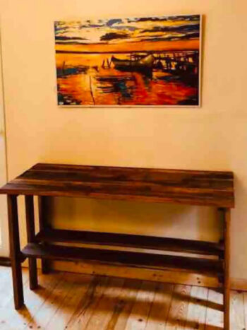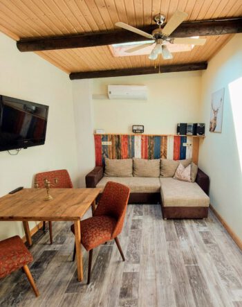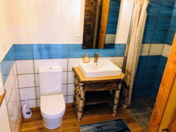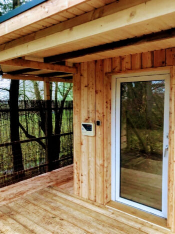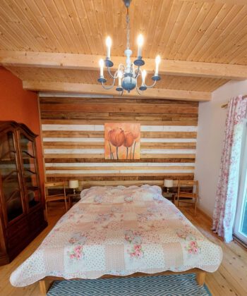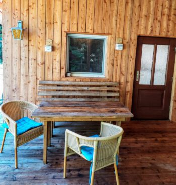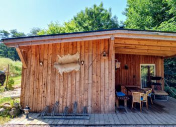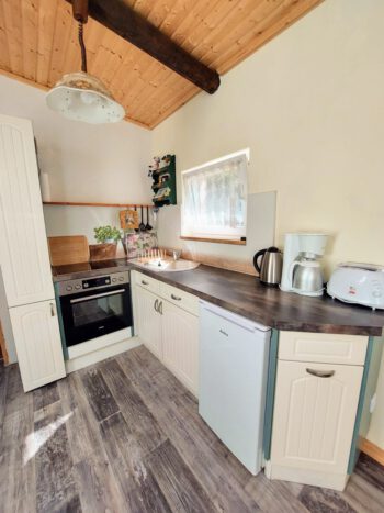 Das rustikale Holzhaus fügt sich sehr gut in die natürliche Umgebung ein. Von der Überdachten Terrasse gelangen Sie in den Wohnbereich. Dieser ist mit einer offenen Küche, einem Sofa mit Schlaffunktion, Sat-TV und Esstisch ausgestattet. Dieser Raum bietet durch die Wohnküche einen Ort zum gemütlichen Beisammensein. Das Schlafzimmer, mit rustikalem Holz Doppelbett, sorgt für einen erholsamen Schlaf. Das Bad ist mit einer ebenerdigen Dusche ausgestattet. Die Ausstattung und Einrichtung zeichnet sich durch viel Liebe zum Detail aus.