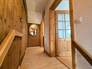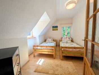 Das komfortabel ausgestattete Haus erstreckt sich über 2 Etagen. Im Erdgeschoss befindet sich der offene Wohnbereich, mit voll ausgestatteter Küche. Für wohlige Wärme sorgt ein Kaminofen. Das helle Badezimmer bietet Ihnen eine Badewanne zum entspannen. Im Obergeschoss befinden sich die beiden Schlafzimmer. Ein Schlafzimmer mit Doppelbett und TV und 1 Schlafzimmer mit 2 Einzelbetten. Vom Schlafzimmer und aus der Küche genießen Sie einen Blick auf den Privatsee.
