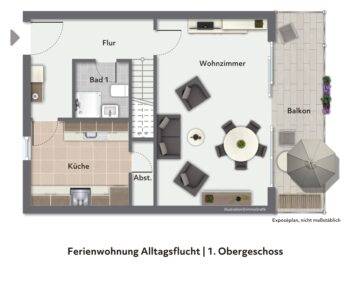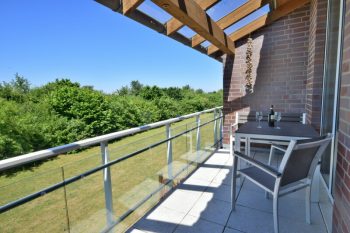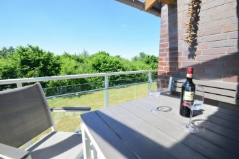Im Untergeschoss befindet sich das großzügige, helle Wohnzimmer mit Sat-TV (Smart-TV mit Internet), Spielen, Büchern und DVDs für Erwachsene und Kinder, ein großer Esstisch, Stereoanlage und Blu-Ray Player. WLAN steht Ihnen auf dem gesamten Gelände kostenlos zur Verfügung. Das große Sofa lässt sich bequem zu einem hochwertigen Bett mit Kaltschaummatratze und Ergo-Flex Lattenrost umbauen. Die Fenster in der Wohnung sind mit Fliegenschutzgittern ausgestattet. Vom Wohnzimmer gelangen Sie auf den Balkon, von dem Sie einen herrlichen Blick über die naturbelassene, unverbaute Halbinsel bis zur Ostsee genießen können. Vom Balkon können Sie zudem traumhafte Sonnenuntergänge bei einem Glas Wein genießen. Der Balkon ist mit einer Sitzgruppe, 2 Klapp-Hochlehnern und Kinderstühlen ausgestattet.