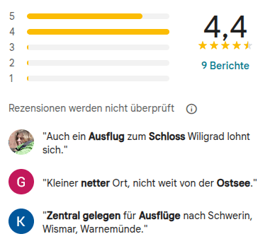 In nur 20 Minuten erreichen Sie mit dem PKW die Landeshauptstadt Schwerin. Das Schloss, der Schlossgarten und die Altstadt mit dem Dom sind sehr sehenswert. In Schwerin finden Sie z.B. einen Zoo, Fernsehturm, Kletterwald, Kino, Bowling, Einkaufszentren, Minigolf, Indoorspielplatz, Feuerwehrmuseum, Schifffahrten und vieles mehr. Die Hansestadt Wismar, welche zum UNESCO Weltkulturerbe gehört, erreichen Sie ebenfalls in 15-20 Minuten. Der Hafen und die Altstadt sind sehr sehenswert. In ca. 25 min erreichen Sie die tollen Strände an der Ostsee, z.B. Zierow, Wohnlenberger Wiek oder Hohen Wieschendorf.