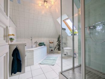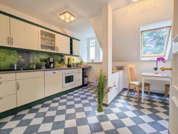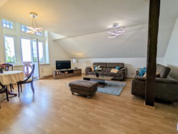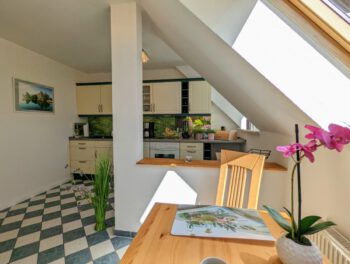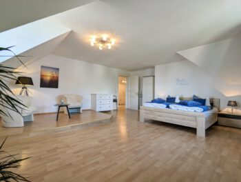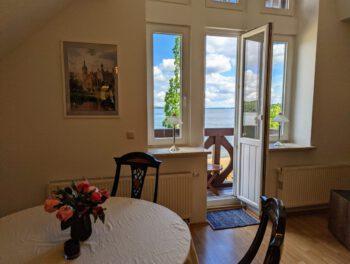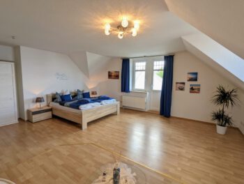 Auf 100 m² Wohnfläche bietet die Ferienwohnung genügend Freiraum für 2 Personen. Die Wohnung erstreck sich über das gesamte Dachgeschoss und bietet dadurch den schönsten Blick über den Schweriner See, bis zum Horizont. Von der Diele gelangen Sie in alle Räume. Das Wohnzimmer lädt mit einer großen Sofalandschaft und einem Essbereich zu gemütlichen Stunden ein. Vom Wohnbereich gelangen Sie auf den kleinen Balkon. Genießen Sie den freien Blick über den ganzen Schweriner See und zur Insel Kaninchenwerder. Das Schlafzimmer bietet mit seinem Doppelbett und der Leseecke einen idealen Ruhebereich. Auch von hier haben Sie einen wundervollen Blick auf den See. Auf Wunsch können Sie ein zweites Schlafzimmer mit Einzelbett hinzu bekommen. In der voll ausgestatteten Küche können Sie Ihre Lieblingsspeisen zubereiten. Das Bad ist mit Badewanne und einer großen Dusche ausgestattet. Zur Unterhaltung stehen Ihnen ein Smart-TV und WLAN zur Verfügung. Parken können Sie direkt vor dem Haus. Ein SUP (Stand Up Paddle) können Sie kostenfrei nutzen.