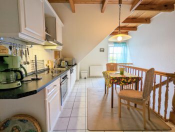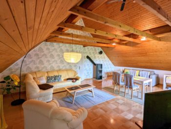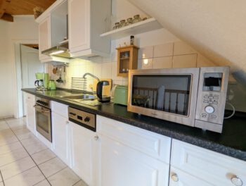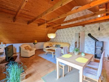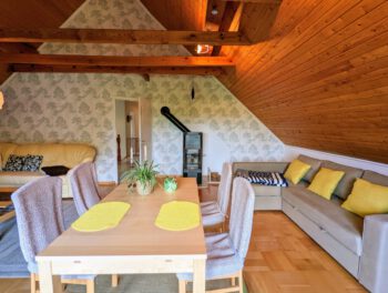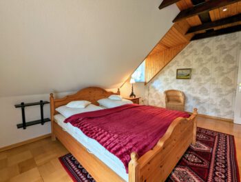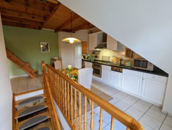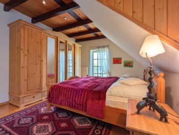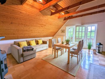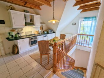 Wenn es einen Ort zum Träumen und Entspannen gibt, könnte es zweifelsfrei dieser sein. Inmitten der schönsten Natur Mecklenburgs, zwischen dem Schönlager See, dem Fluss Warnow, Feldern und Wäldern fügt sich die „Villa Schönlage“ sehr harmonisch in das eindrucksvolle Landschaftsbild ein. Auf 110 m² haben bis zu 6 Personen ausreichend Platz, für einen erholsamen Urlaub. Die hochwertige und rustikale Einrichtung sorgt für Wohlfühlatmospäre. In der voll ausgestatteten Küche können Sie Ihren Lieblingsspeisen zubereiten. Auf Wunsch gibt es morgens sogar ein Ei von den hofeigenen Hühnern. Das Bad ist mit ebenerdiger Dusche + Badewanne ausgestattet. Das gemütliche Schlafzimmer mit Doppelbett lädt zum Ausschlafen ein. 2 weitere Personen können es sich im Wohnzimmer auf dem Schlafsofa gemütlich machen. Sofern das Haus von 5-6 Personen gebucht wird, steht Ihnen ein weiteres Schlafzimmer mit Schlafsofa sowie ein weiteres Vollbad in der unteren Etage zur Verfügung. Die Wohnung verfügt über 2 Balkone, mit traumhaften Ausblick in den Garten und über das Feld. Sie gelangen von allen Räumen auf den Balkon.