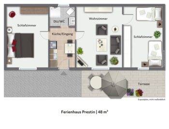 Das Ferienhaus bietet auf 48 m² Fläche ausreichend Platz für bis zu 4 Personen. Das Haus ist mit einer voll ausgestatteten Küche, Wohnzimmer mit Sat-TV, 1 Schlafzimmer mit Doppelbett (lassen sich als Einzelbetten auseinanderstellen), 1 Schlafzimmer mit 2 Einzelbetten und einem Duschbad ausgestattet. Für Wärme sorgt an kühleren Tagen eine Zentralheizung. Im Garten befindet sich eine überdachte Sitzmöglichkeit mit Grill und schönen Ausblick ins Grüne. Ein PKW Stellplatz befindet sich auf dem Hof. Das Haus ist sehr kinderfreundlich mit vielen Spielen, Kinderhochstuhl und Kinderbett ausgestattet.