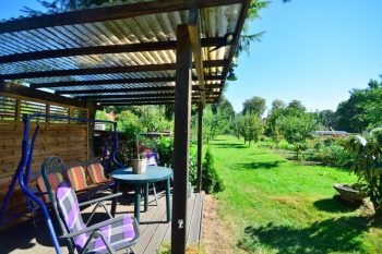 Das Haus befindet sich auf dem Hinterhof des Gastgebers auf einem 2000 m² großem Grundstück. Das Grundstück besitzt einen Gemüse- und Obstgarten, der zum Naschen einlädt. Die Hühner auf dem Hof liefern morgens ein frisches Ei. Die netten Vermieter stellen auch gern mal ein selbst gekochtes Glas Marmelade auf den Tisch. Das ist Landleben pur.