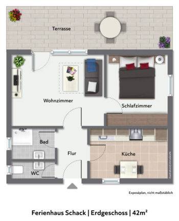 Das Haus ist ca. 42 m² groß und besitzt 1 Schlafzimmer mit Doppelbett, 1 Wohn-Schlafzimmer mit Schlafsofa, Sat-TV, Radio und Gesellschaftsspielen, ein Bad mit Dusche, ein extra WC und 1 voll ausgestattete Küche.
