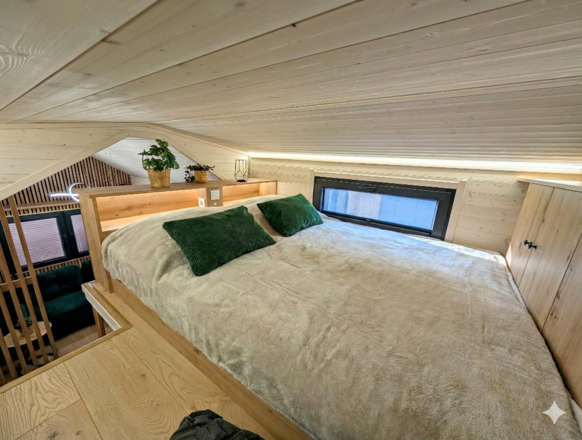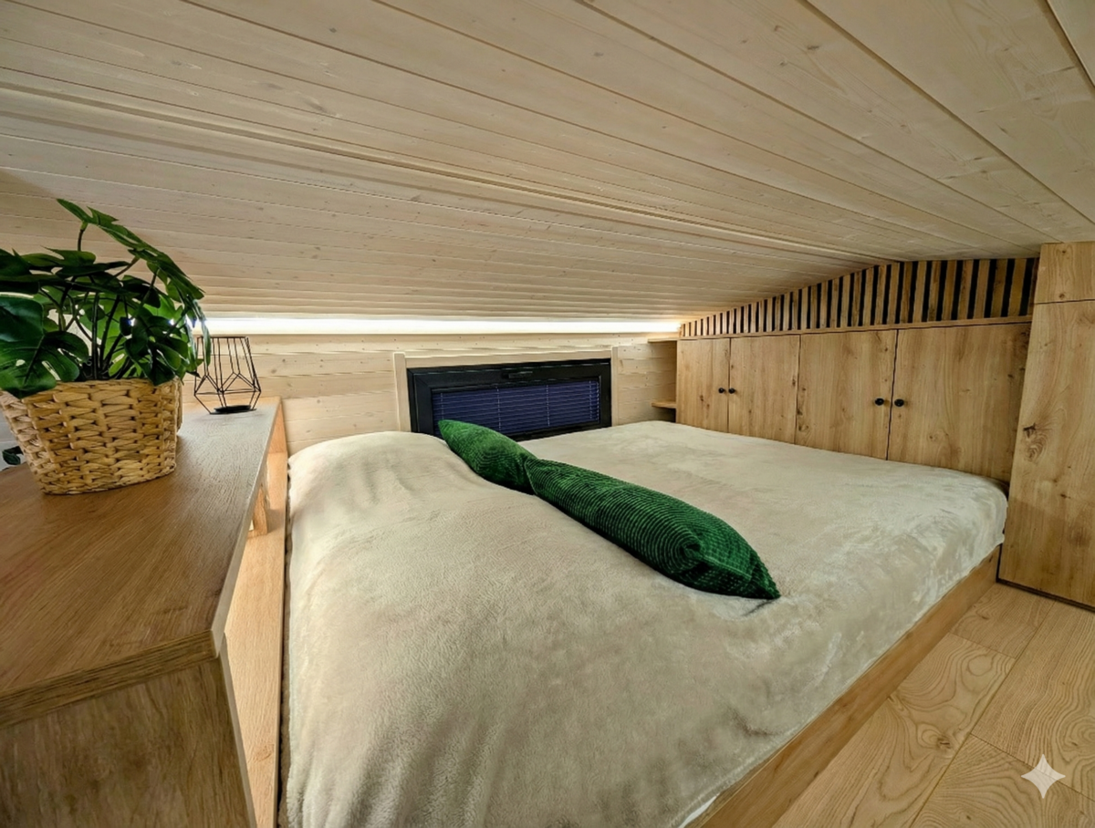 - Schlafen wie auf Wolken: Über eine bequeme Treppe (mit viel Stauraum) gelangst du ins Schlafloft. Das 1,60m breite Bett ist so gemütlich, dass ein erholsamer Schlaf vorprogrammiert ist. Von hier oben wachst du morgens mit dem besten Ausblick auf – direkt in die Natur.