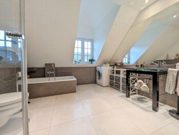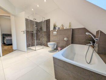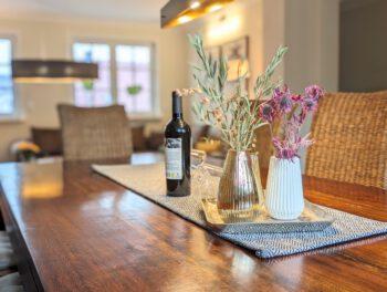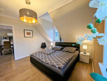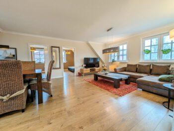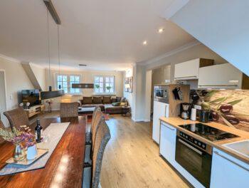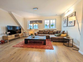 In dieser Wohnung finden Sie eine stilvolle Ausstattung und hohen Wohnkomfort. Auf 120 m² bietet die Wohnung bis zu 6 Personen ausreichend Raum für einen erholsamen Urlaub. Der große Wohnbereich, mit Sofalandschaft, voll ausgestatteter Küchenzeile und Essbereich, lädt zum Verweilen mit der Familie oder Freunden ein. Insgesamt verfügt die Wohnung über drei Schlafzimmer mir je einem Doppelbett. Im großzügigen und modernen Badezimmer finden Sie eine Badewanne, eine separate Dusche, einen Waschbereich und eine Waschmaschine. Im Erdgeschoss befindet sich zudem ein Gäste WC zur Mitnutzung. Beheizt wird die gesamte Wohnung über eine Fußbodenheizung. An allen Fenstern befinden sich elektrische Rolläden. WLAN ist im gesamten Haus kostenlos vorhanden. Die Wohnung liegt in der 1. Etage. Im Erdgeschoss befindet sich nur eine Garage.